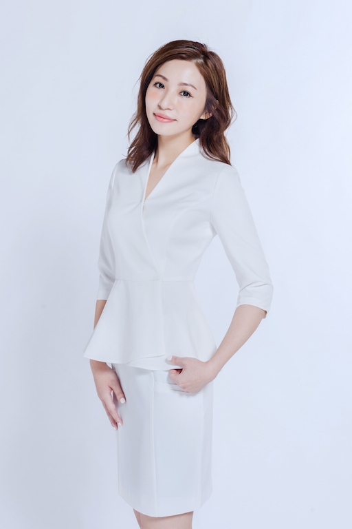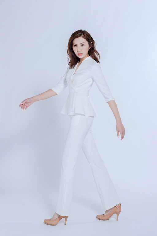 純白高腰式的上衣設計,腰間以波浪狀的剪裁來達到修飾身材的套裝