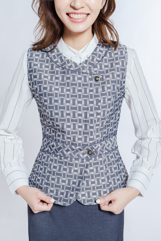 高腰設計西裝外套搭配灰白格紋不對稱背心,流行中不失經典